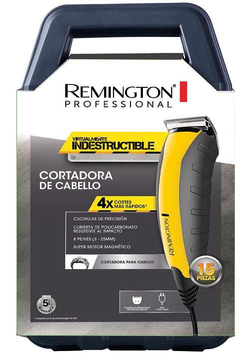 . Cubierta de policarbonato resistente al impacto. . Motor potente de corte lineal. Permite que las cuchillas logren cortes limpios y precisos. . Kit completo de 15 piezas para cortar cabello en casa. . Cuchillas de acero quirúrgico autoafilables de precisión y larga duración. . Super motor magnético. La cortadora de cabello Remington Virtualmente Indestructible HC5850 es resistente a caídas e impactos, gracias a su cubierta de policarbonato, diseñada para resistir y durar toda la vida, protege la vida del motor y alarga la vida útil del prodcuto.
